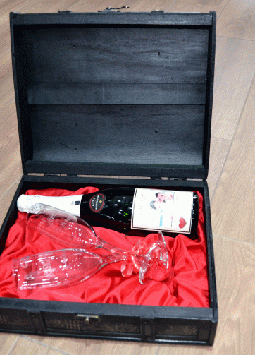 Estuche Baúl de madera + Botella de Cava + Copa personalizada