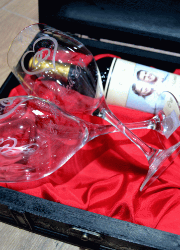 Copas de vino cortas personalizadas y presentadas en baúl de madera