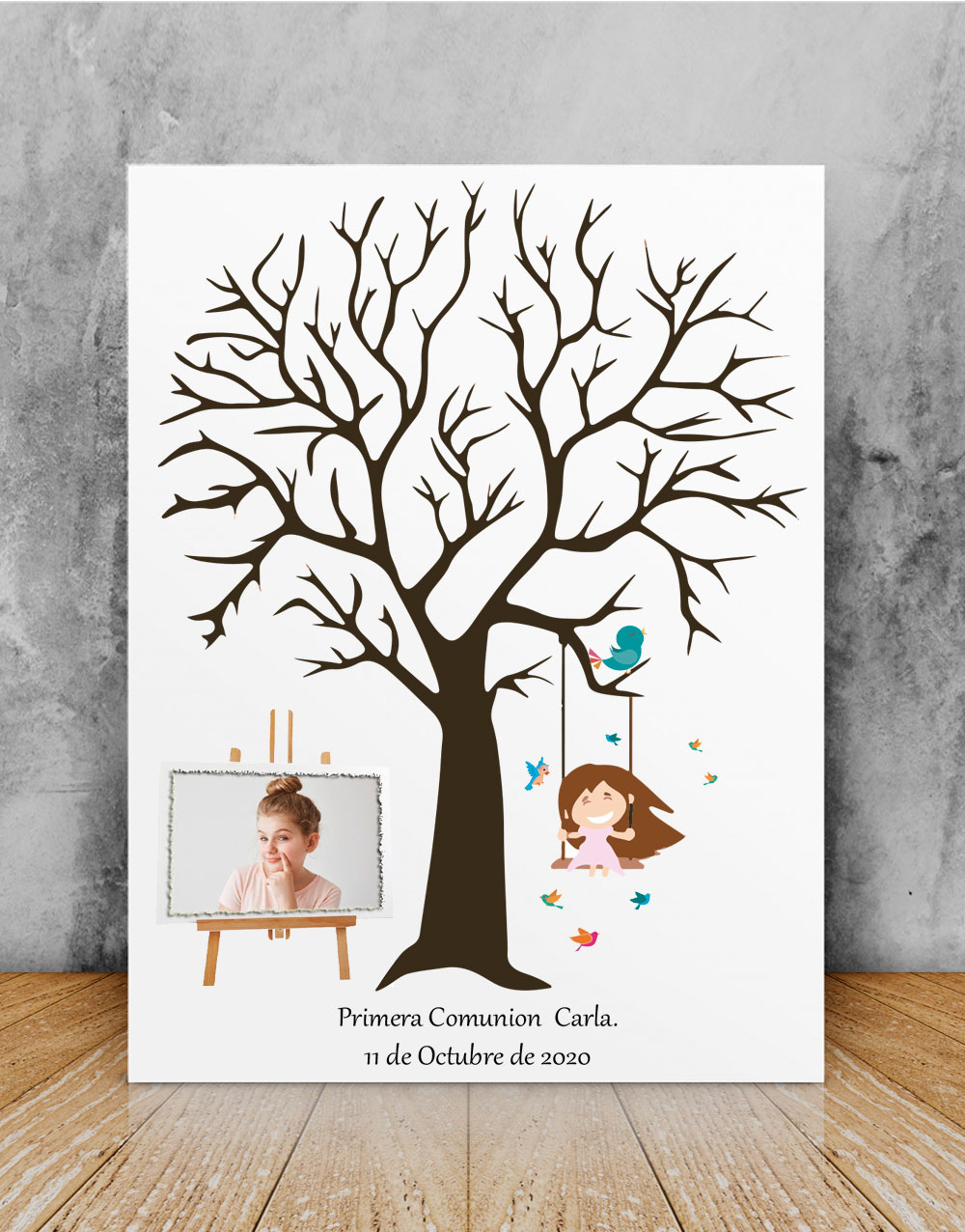 En caso de que quieras añadir una imagen de la chica o el chico, la colocaríamos a pie del árbol en el lado izquierdo. Si quieres ver el resultado final antes de que te lo enviemos solo tienes que solicitarlo en las observaciones durante la compra y te enviaremos una prueba por correo electrónico para que veas como quedaría.