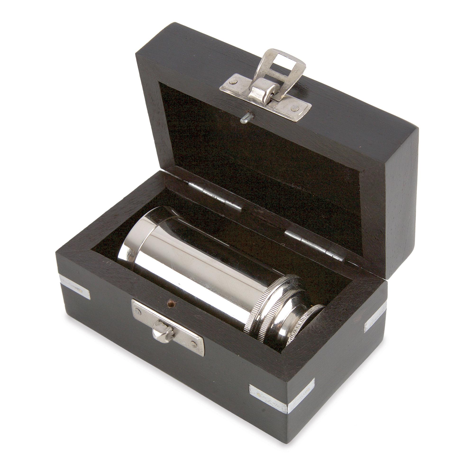 El catalejo está fabricado en metal y la caja de madera tiene unas dimensiones de 10 x 6 x 5 cm.