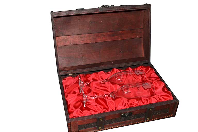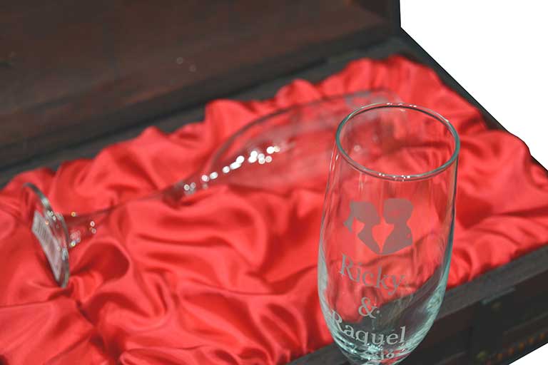 Copas de champagne personalizadas en baúl de madera