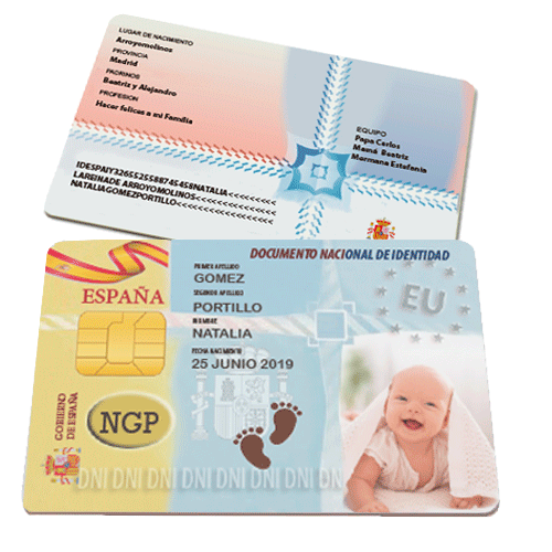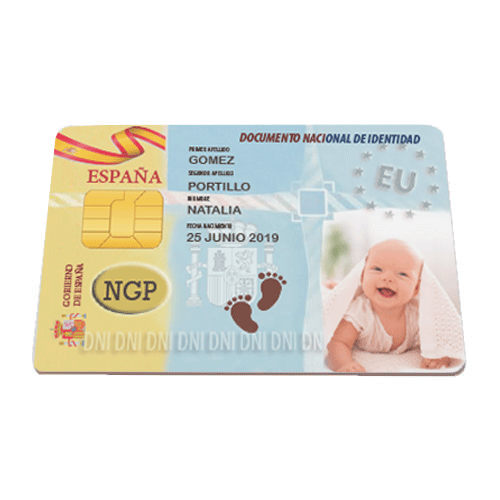 dni personalizado para recién nacidos. Conserva el recuerdo de ese día o utilízalo como invitación para la ceremonia. Fabricado en pvc de alta calidad y 0.90mm de espesor lo que hará que lo conserves toda la vida. PEDIDO MINIMO 5 UNIDADES