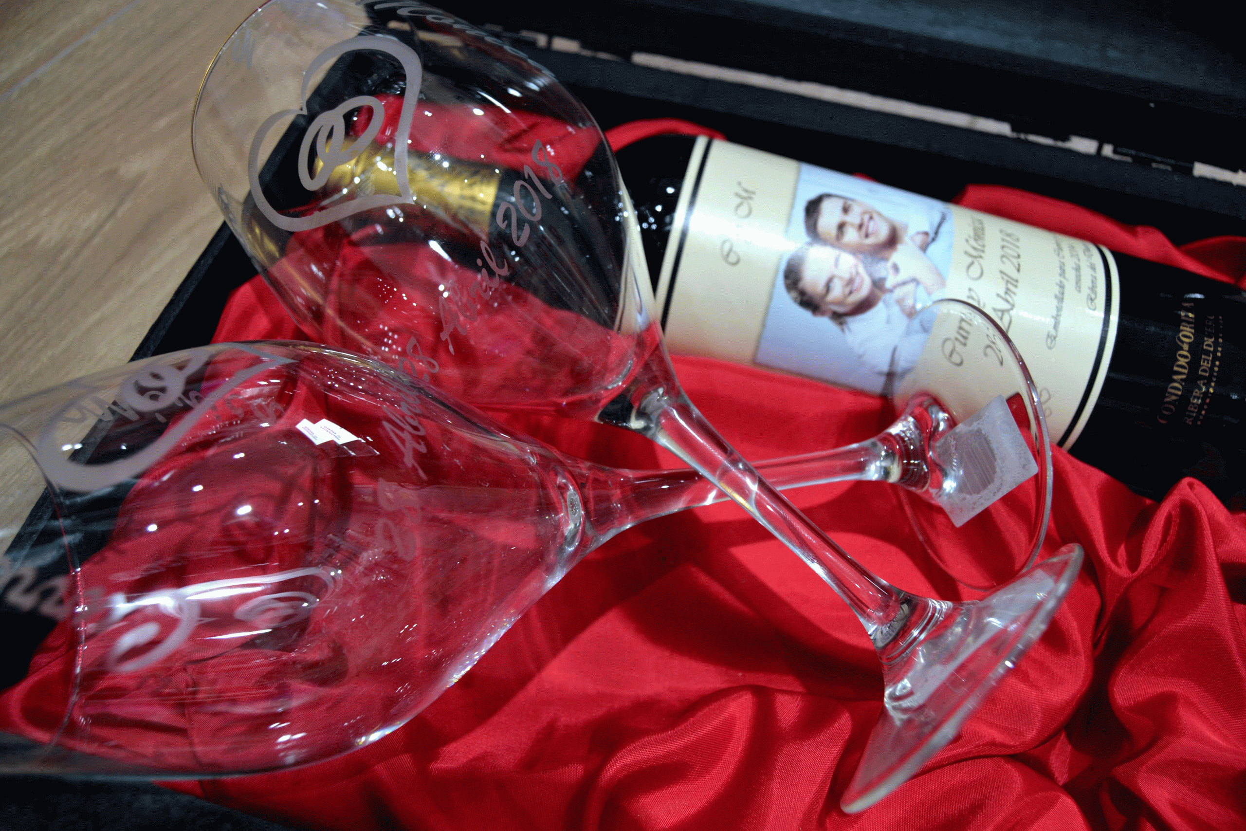 Baúl de madera con dos copas y botella de Rioja Crianza ambos personalizados. La copa con tu nombre o fecha y la botella con etiqueta a color con la foto o texto que prefieras.