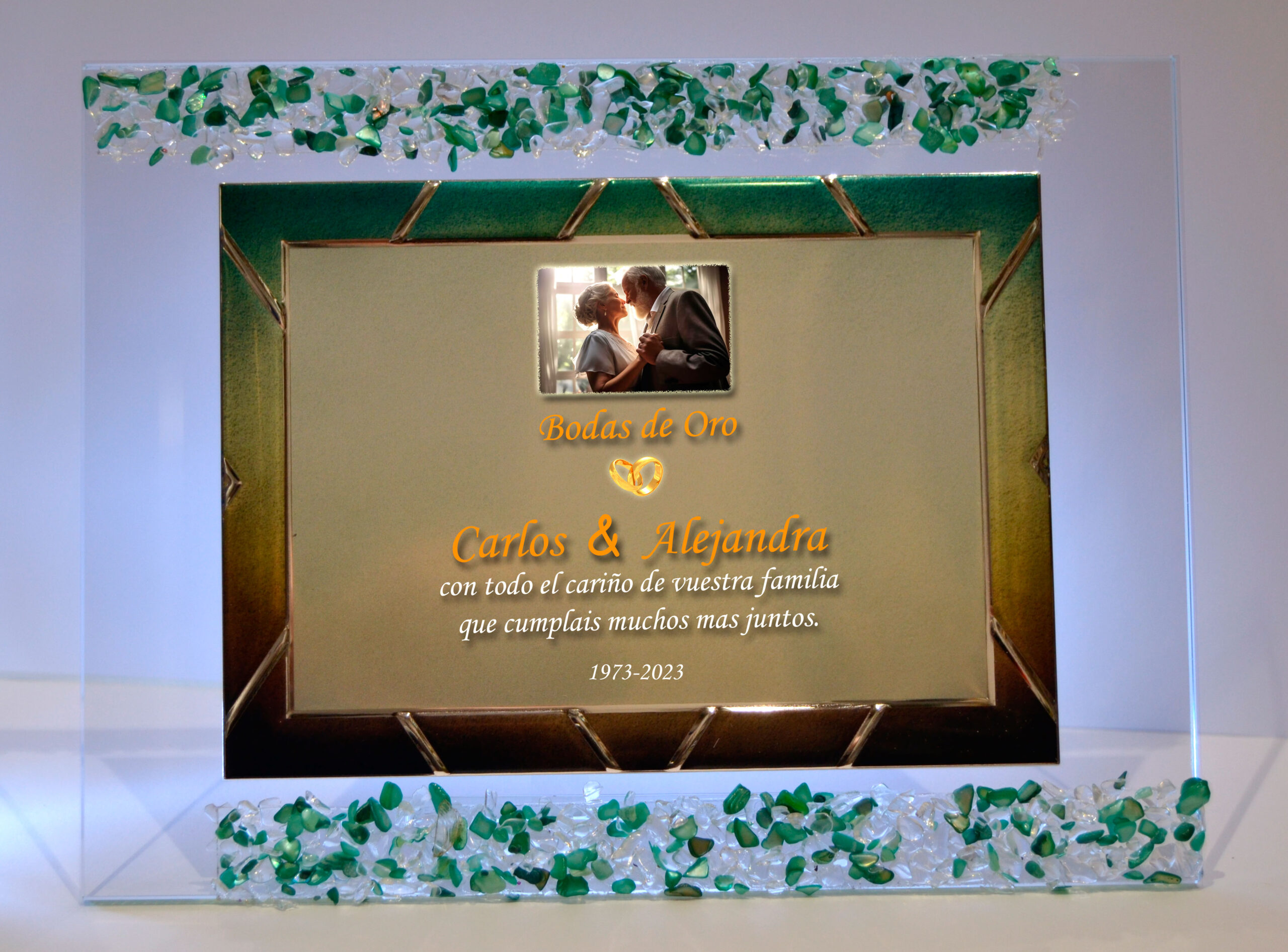 Si quieres sorprenderlo/a , te presentamos esta exclusiva placa conmemorativa sobre cristal con cristales incrustados. Los cristales pegados a mano le aportan una elegancía única, además se imprime sobre una placa plateada (la imagen de muestra puede diferir un poco debido a la luz) con un marco en relieve majestuoso.