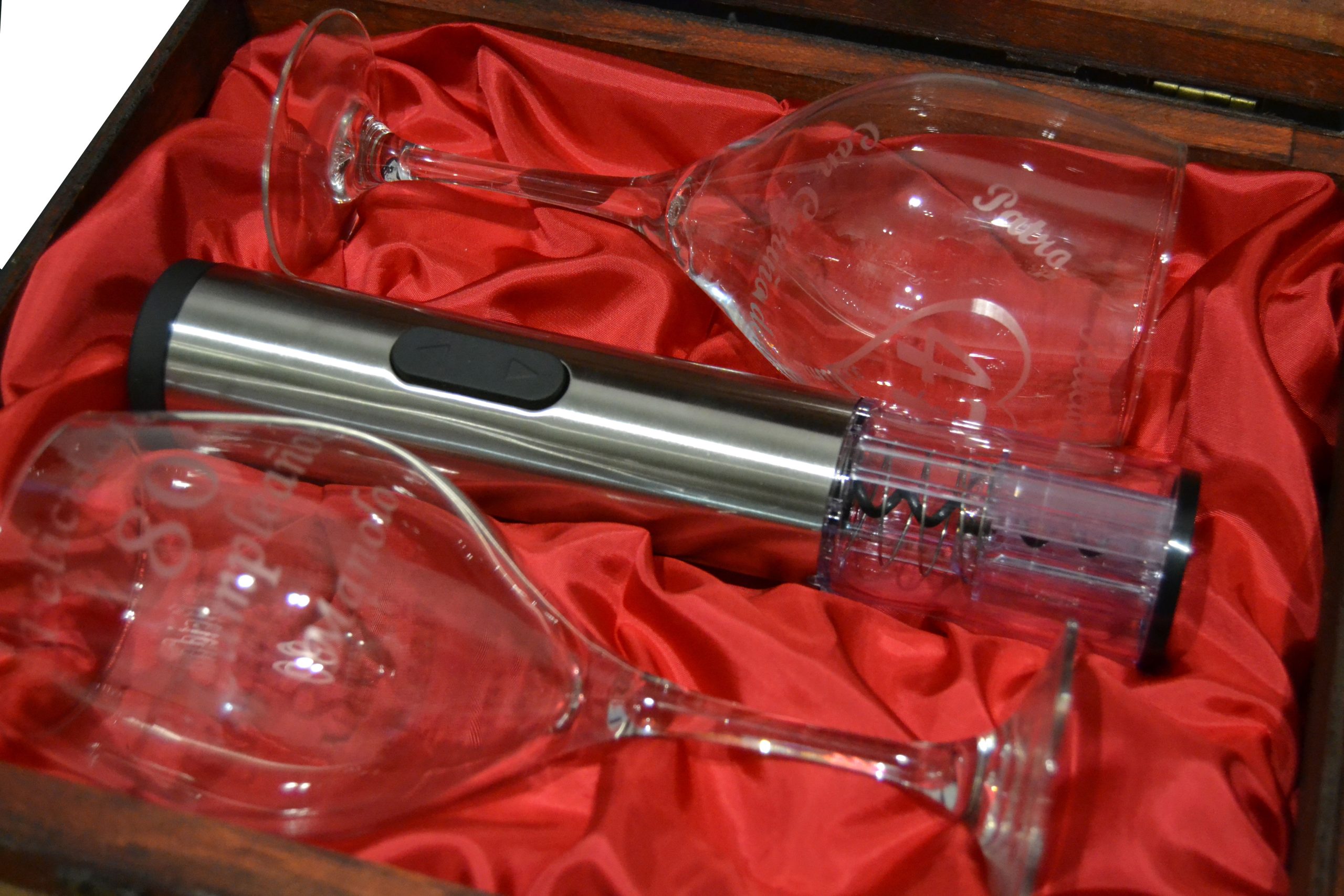 Te presentamos nuestro nuevo set de sacacorchos eléctrico personalizado, fabricado en acero inoxidable y acompañado de dos copas de rioja personalizadas. Todo presentado en este lujoso estuche de madera. Para disfrutar de la experiencia de abrir una buena botella de vino