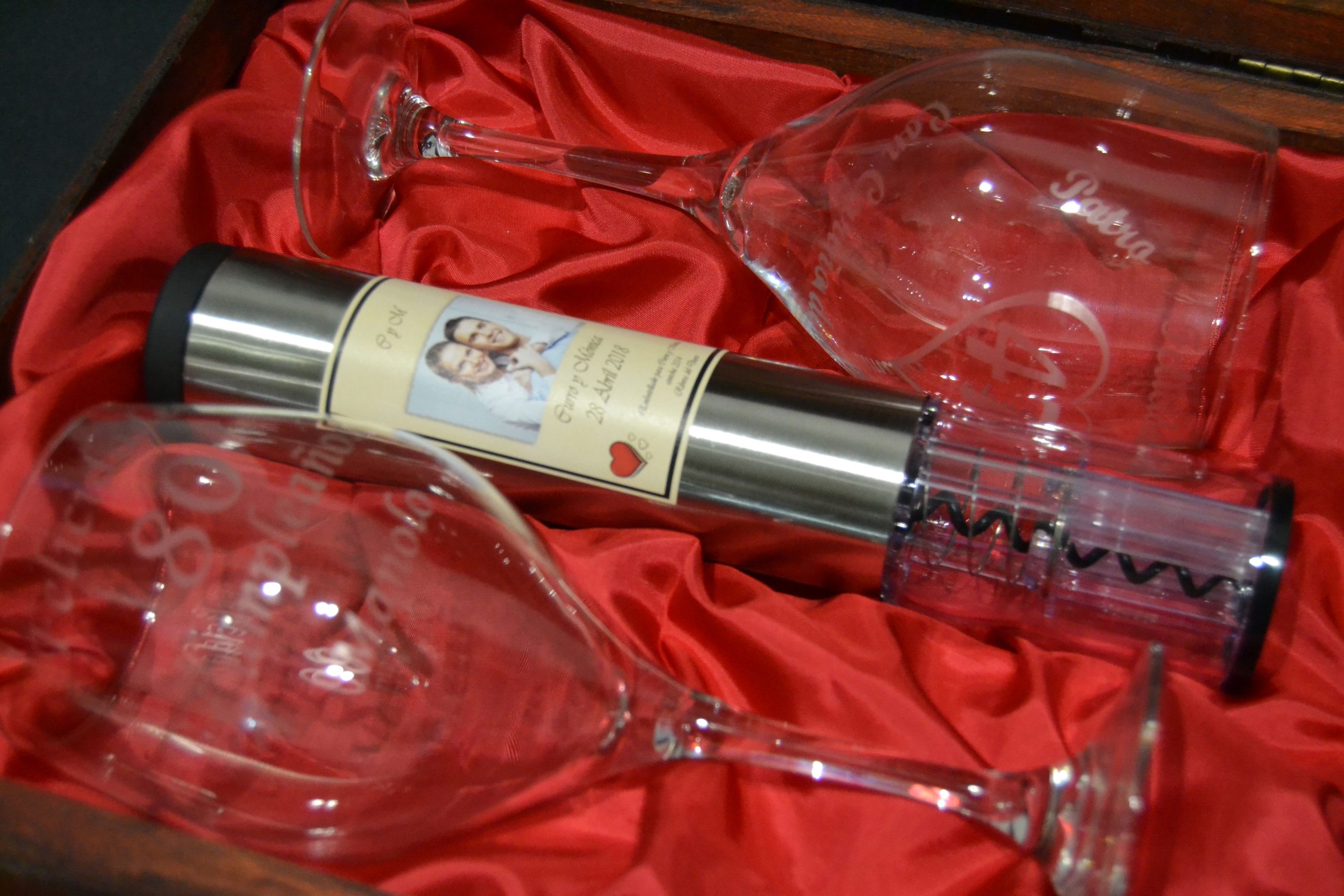 Se personalizan las copas  con tecnología láser y la botella con impresión digital UV lo que les aporta una durabilidad total y un acabado espectacular. Añade tu texto o logo al abridor eléctrico y el texto que quieras añadir a las copas y conviértelo en un regalo único.
