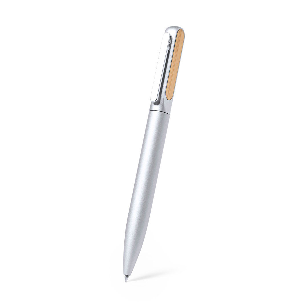 Boligrafo de aluminio en acabado mate con detalle en bambú personalizado, mecanismo giratorio y tinta azul.