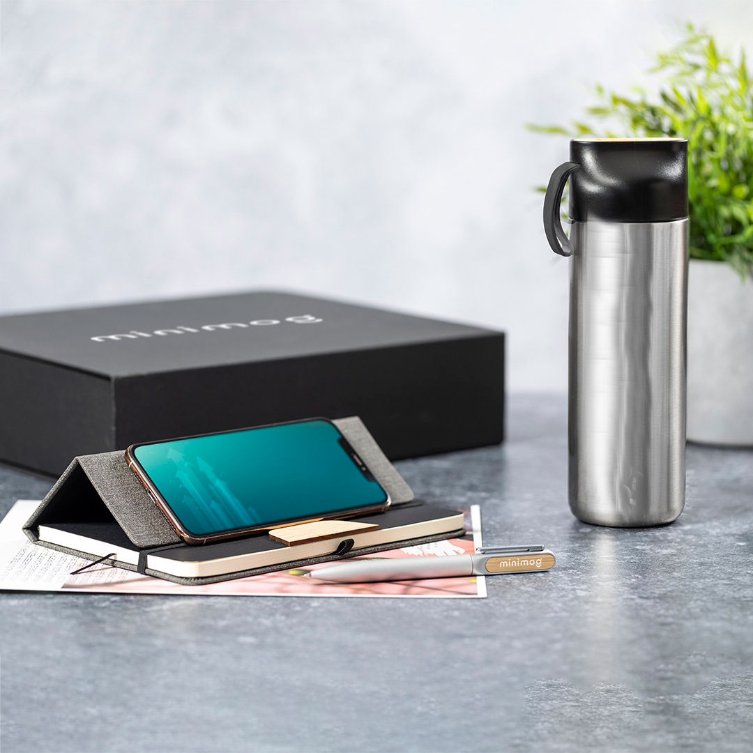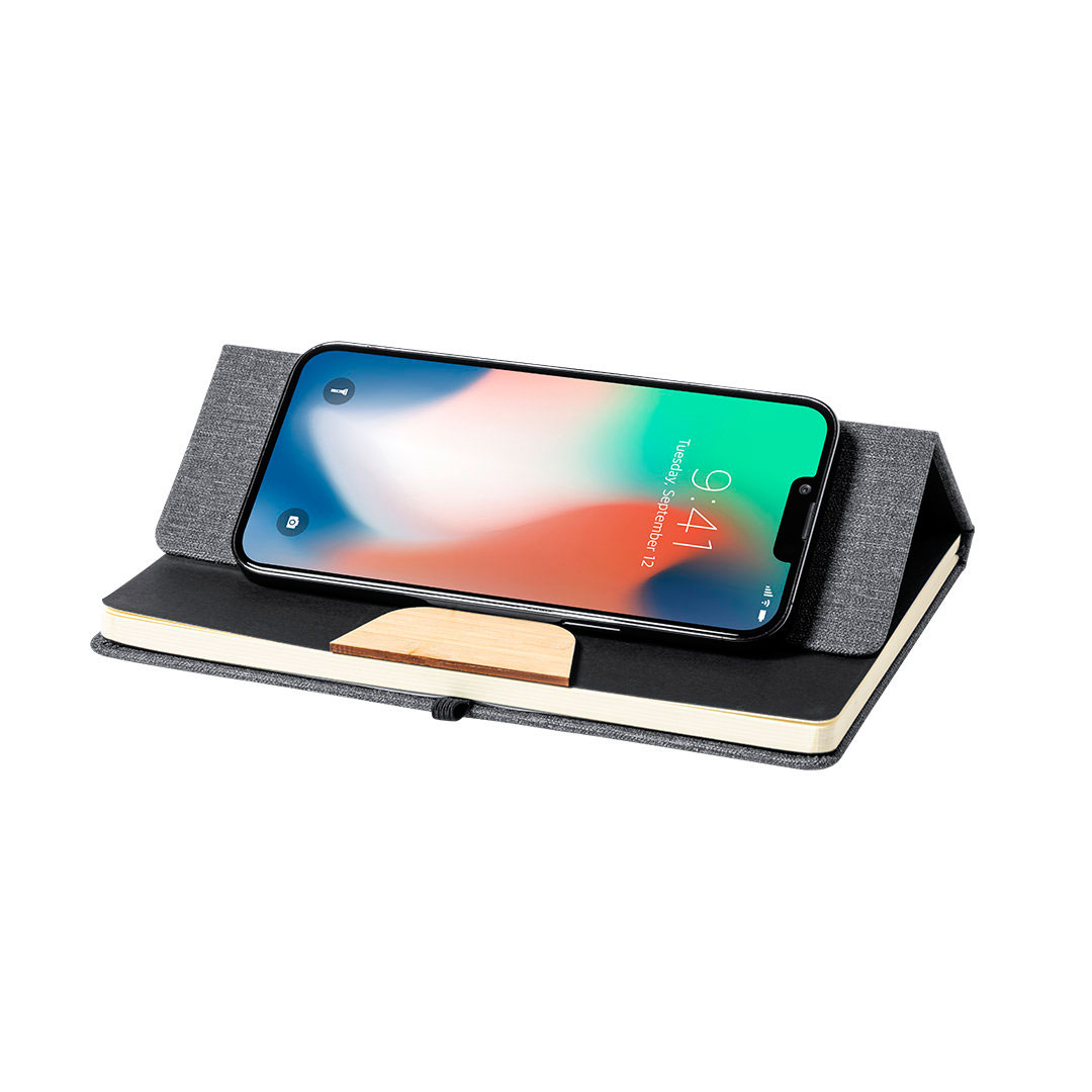 Se compone de un elegante estuche forrado en que encontraras un block de notas con terminación en suave polipiel, con soporte para smartphone integrado en la portada y detalle de bambú personalizado.