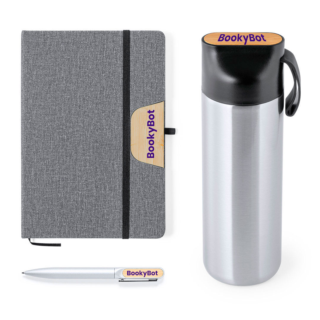 El set se puede personalizar de dos formas, solo los elementos interiores ( termo, boligrafo y block ) personalizados en los detalles de bambú que componen cada elemento. Si lo prefieres y para darle mas cache aún podemos personalizar el estuche con el logo o texto que necesites esto le dara una presentación que sorprendera aún más. Puedes elegirlo en la configuración del mismo.