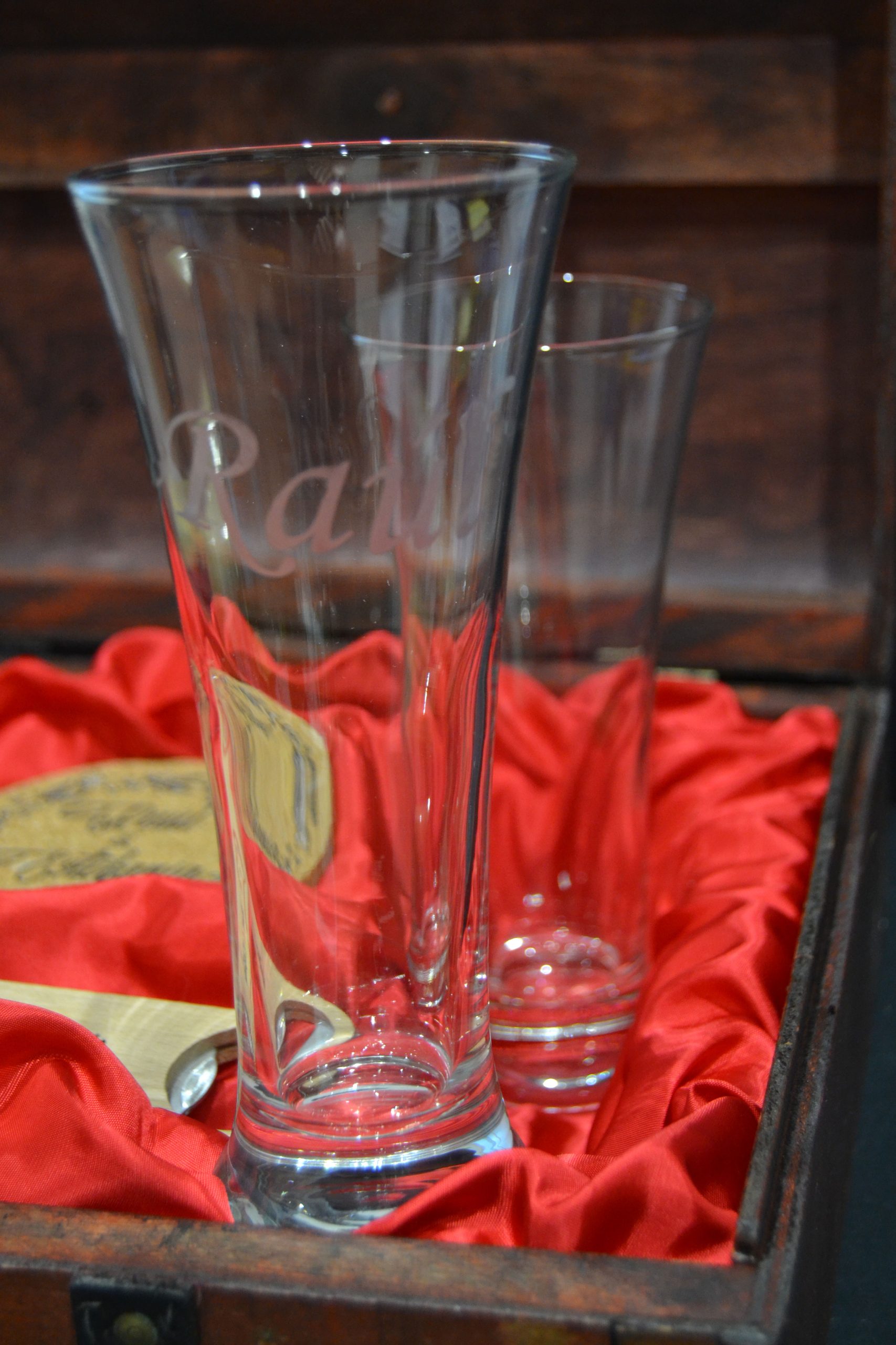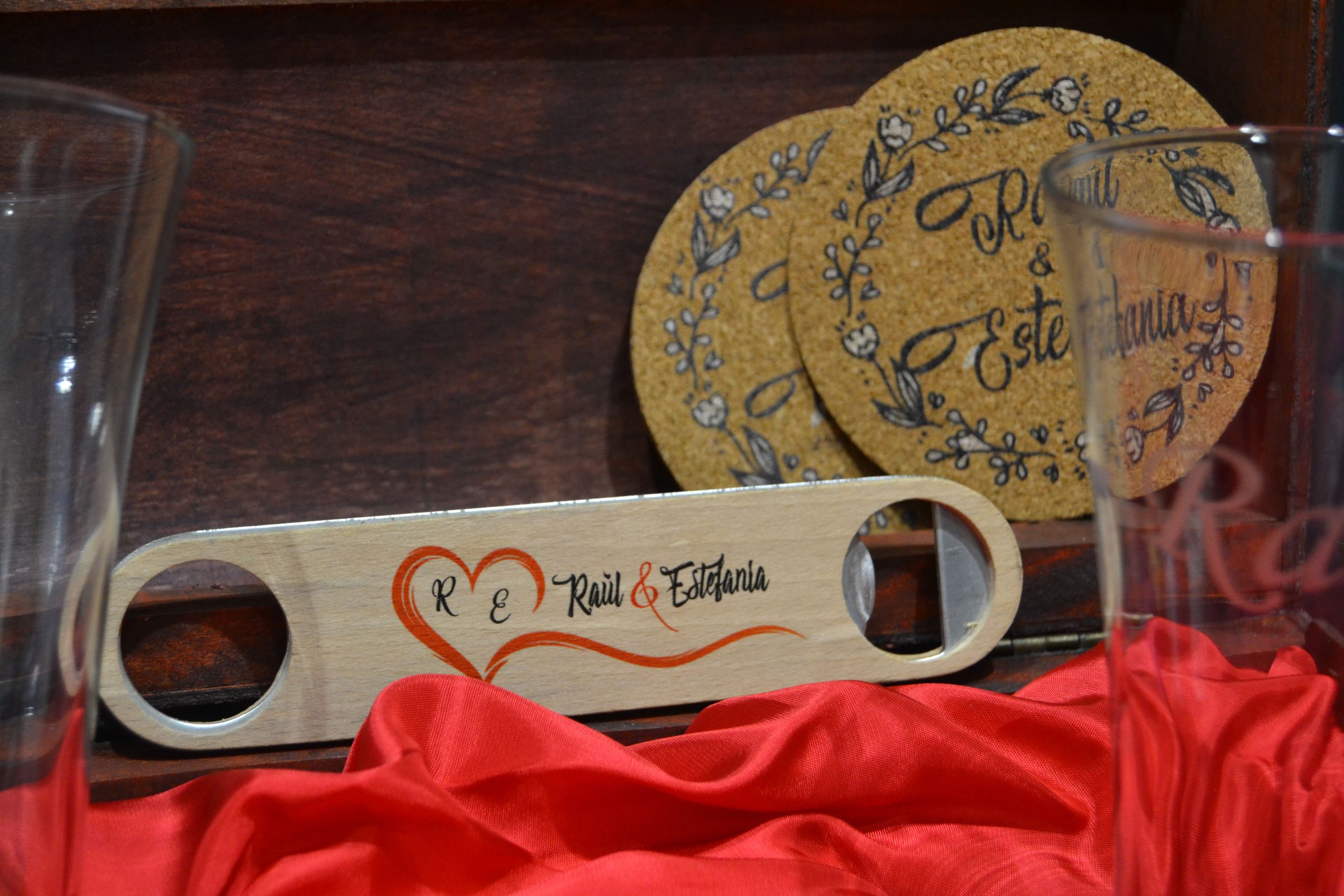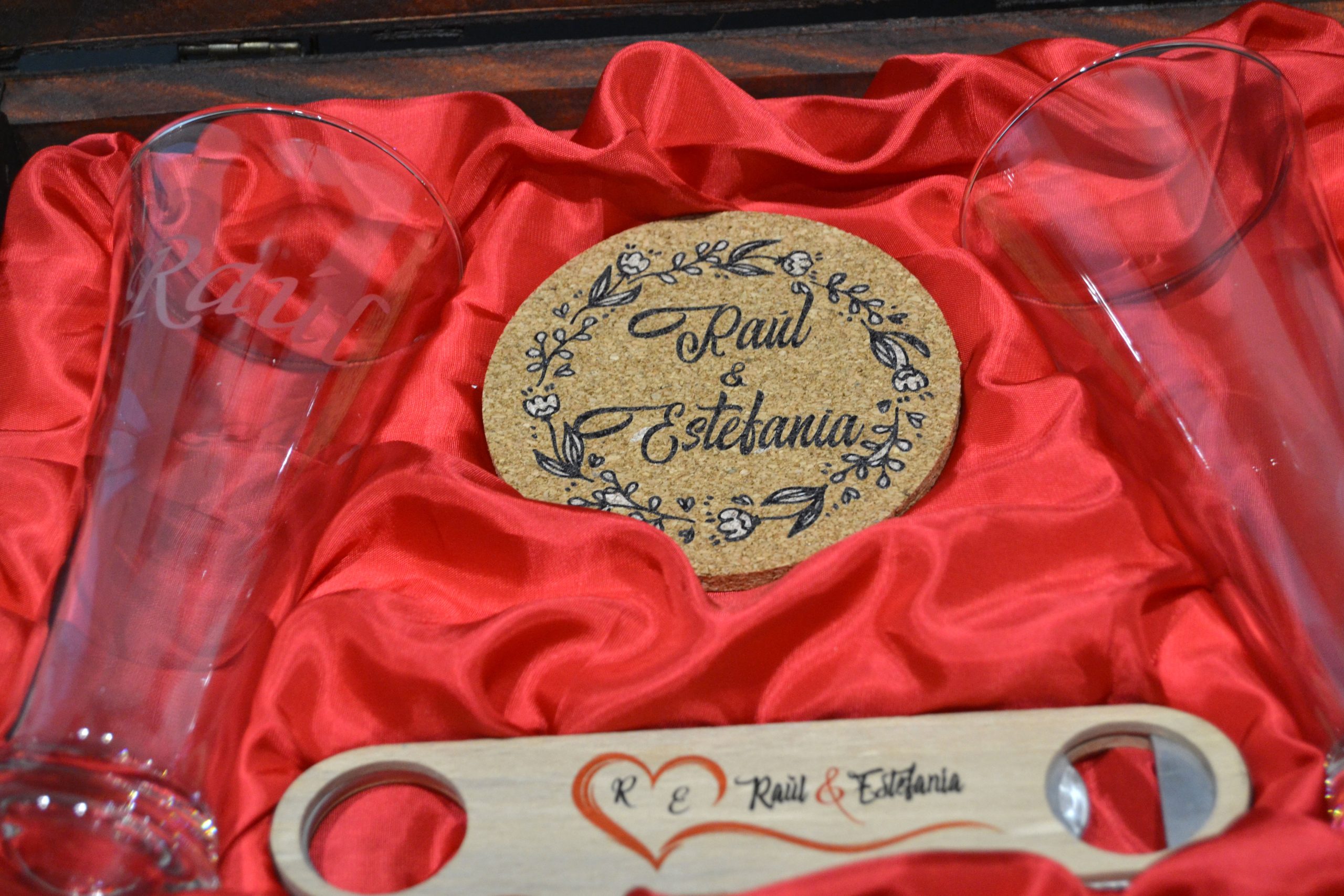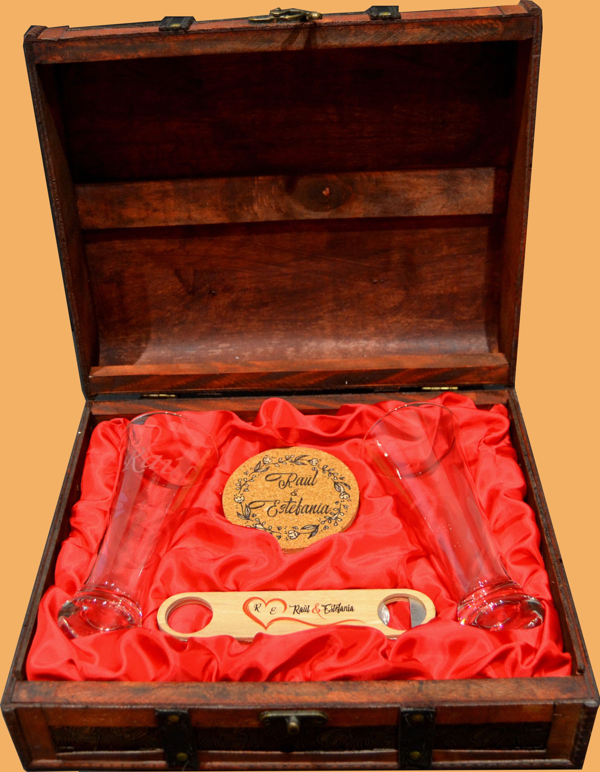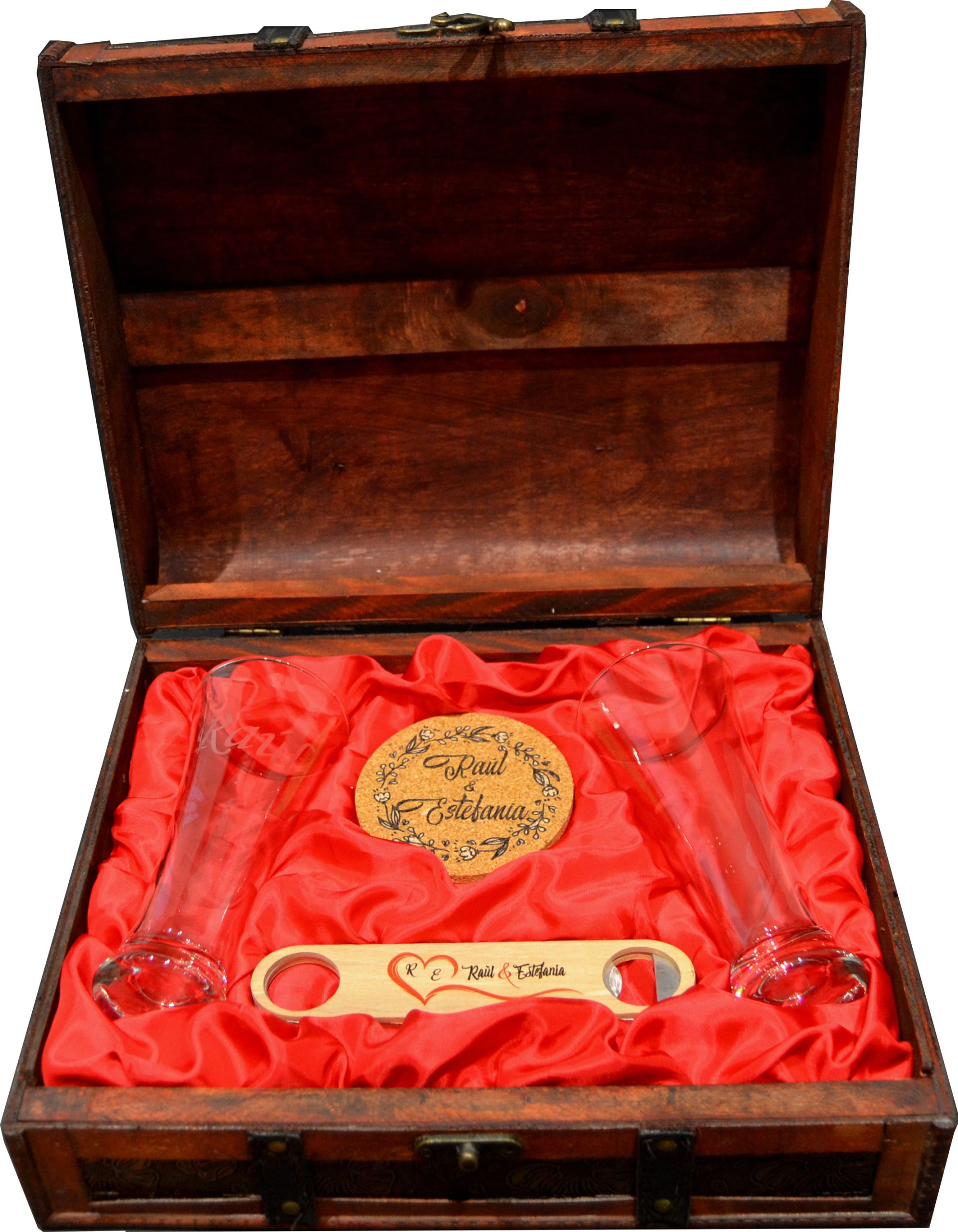 La pareja perfecta, dos vasos largos de diseño espectacular listos para brindar por ese momento o celebración especial. Lujosamente presentados en un elegante baúl de madera con distintos acabados y acompañado de dos posavasos de corcho natural y un potente descorchador, todo ello personalizado.